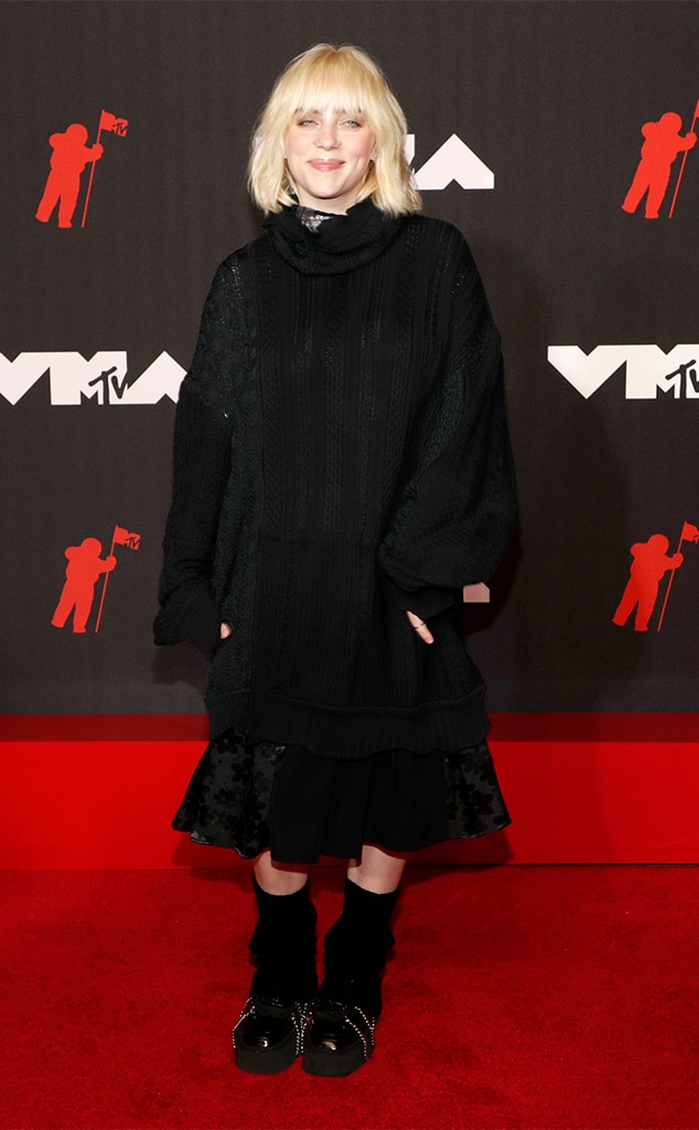 Billie Eilish wore a black sweater dress and confidently posed for photographers on the red carpet of the 2021 MTV Video Music Awards. Billie Eilish stepped on the red carpet of the 2021 MTV Video Music Awards in a black sweater dress while confidently posing for photographers.